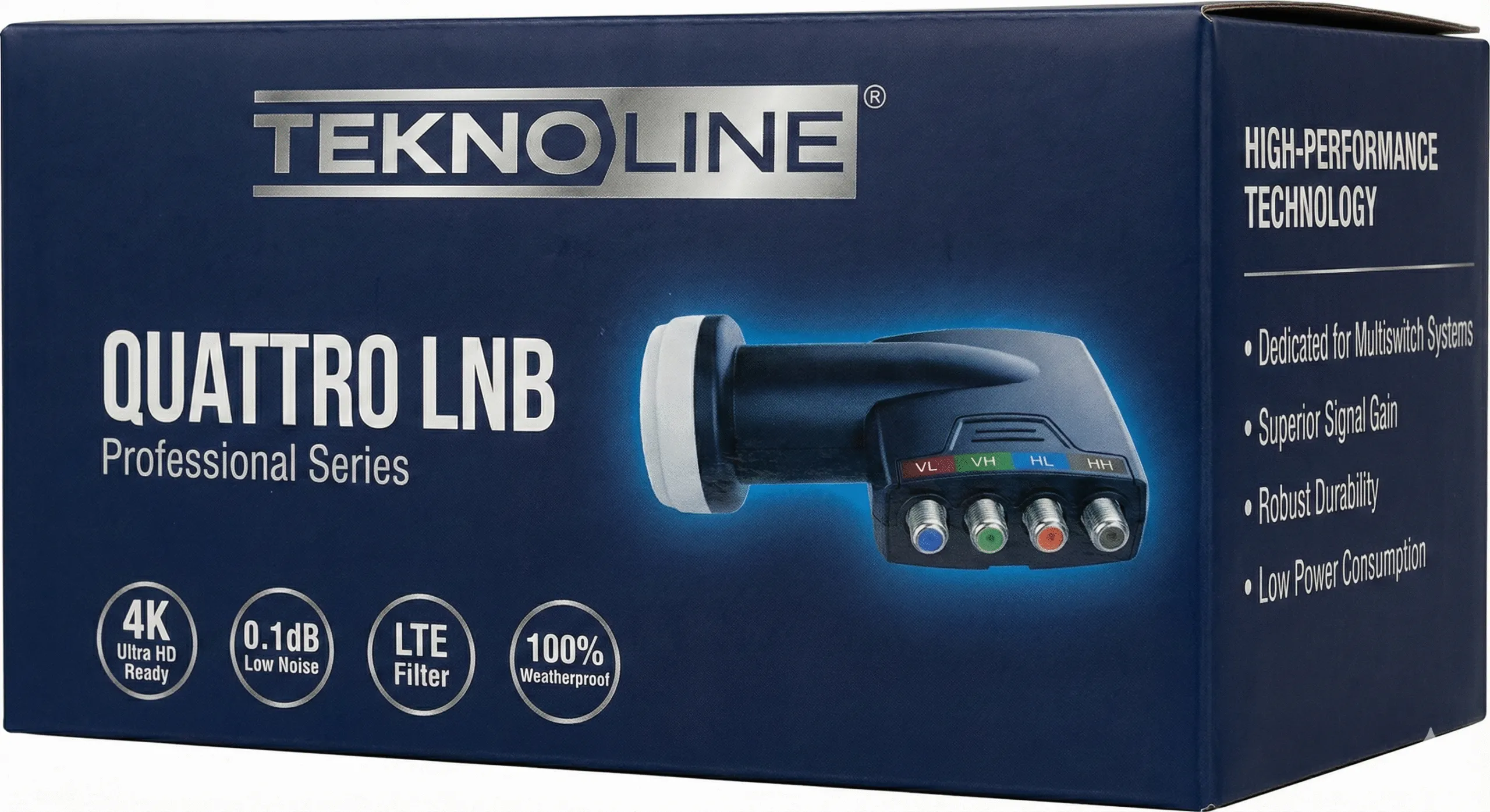 The Teknoline Quattro LNB is a professional-grade satellite receiver designed for central dish systems and multiswitch installations. With an ultra-low noise figure of 0.1dB, it ensures excellent signal quality, minimal interference, and stable performance even in challenging conditions.