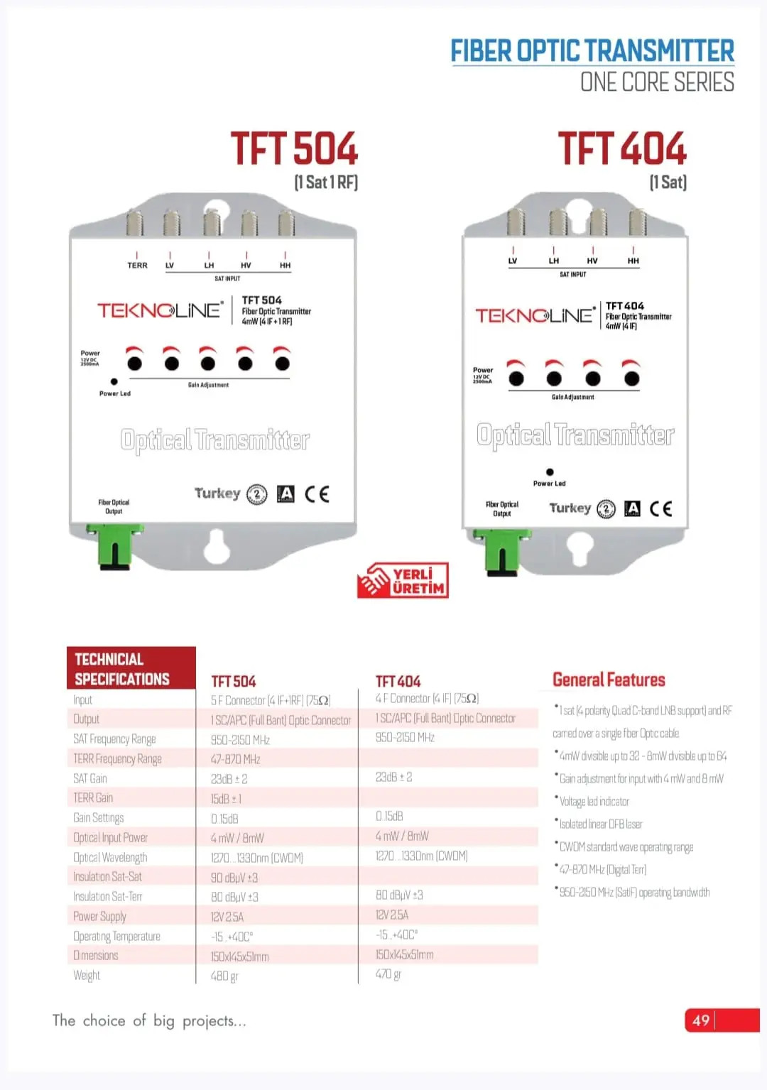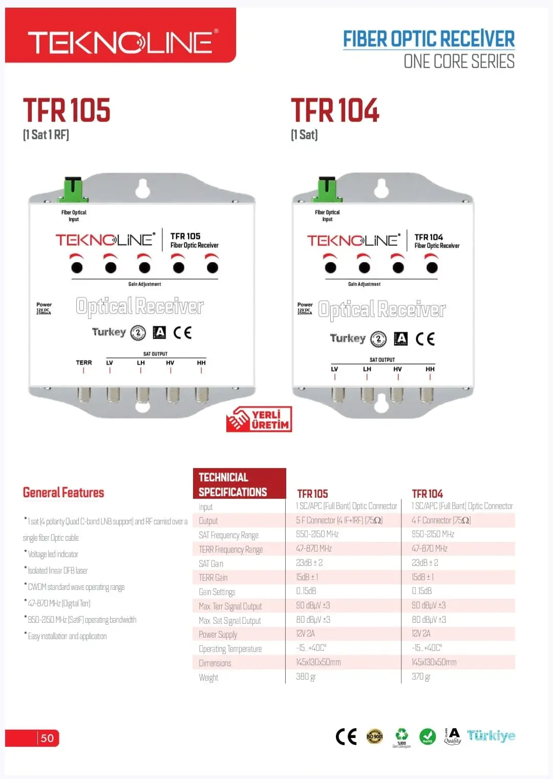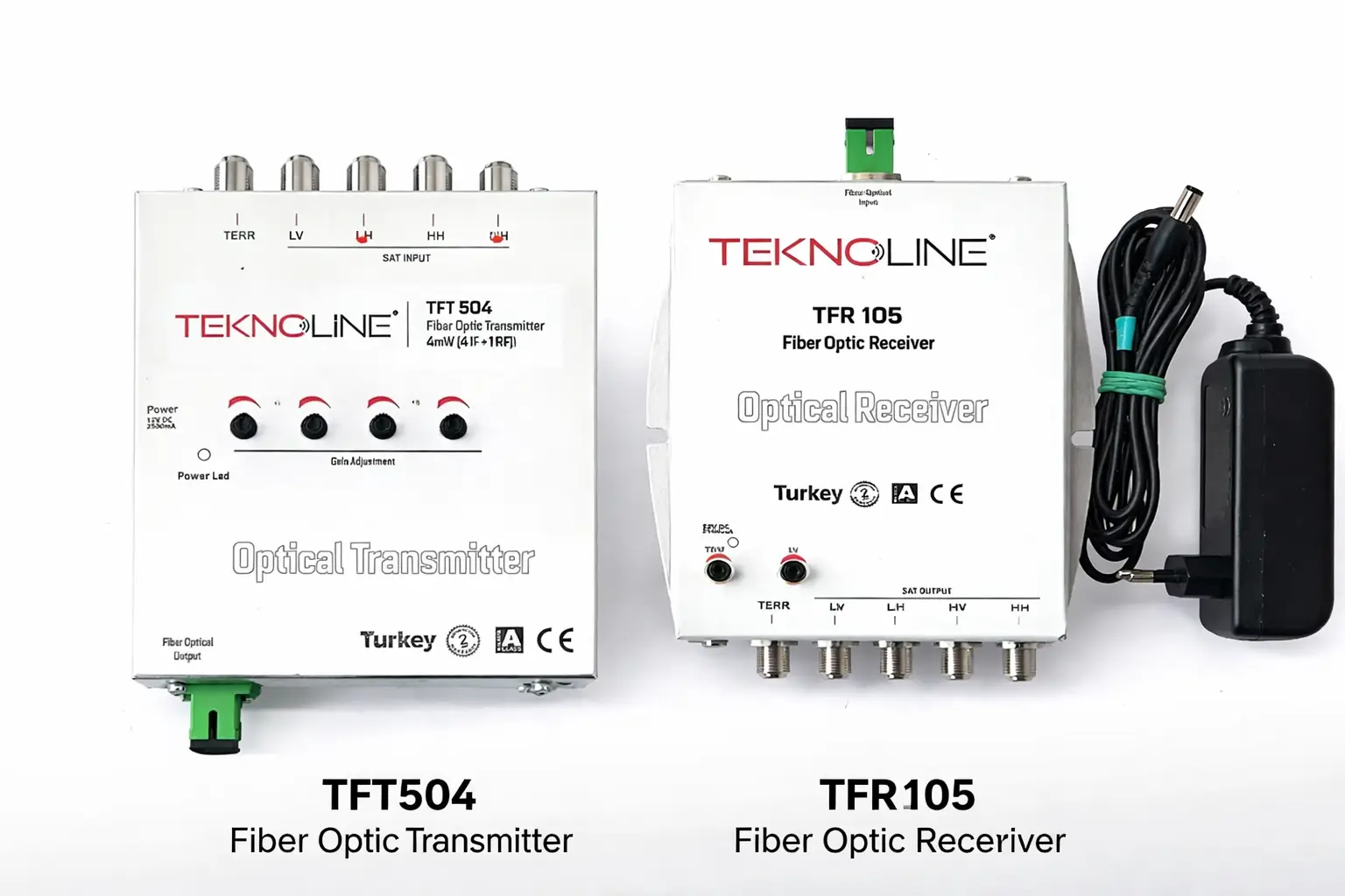 The TEKNOLINE Fiber Optic Kit, consisting of the TFR 105 Receiver and TFT 504 Transmitter, is a professional solution developed for modern SMATV systems that require reliable transmission of satellite and terrestrial signals over long distances using fiber optic infrastructure.