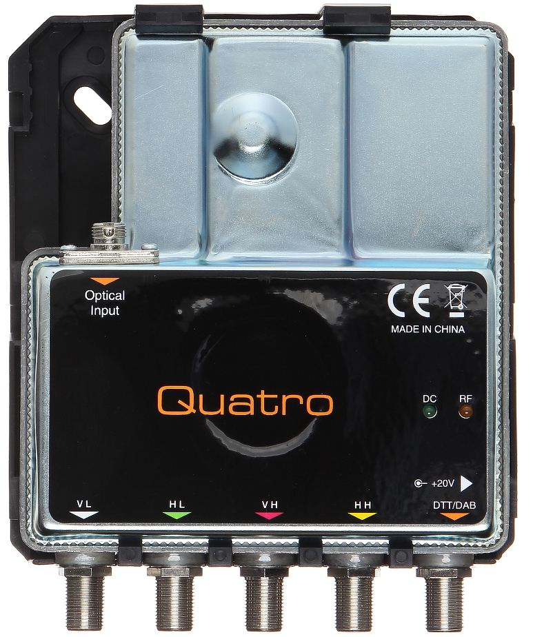 The Triax TVQ 05 Quattro Optical Receiver is a high-performance device engineered for professional SMATV systems, providing efficient conversion from optical fiber signals to RF with excellent stability and signal quality.