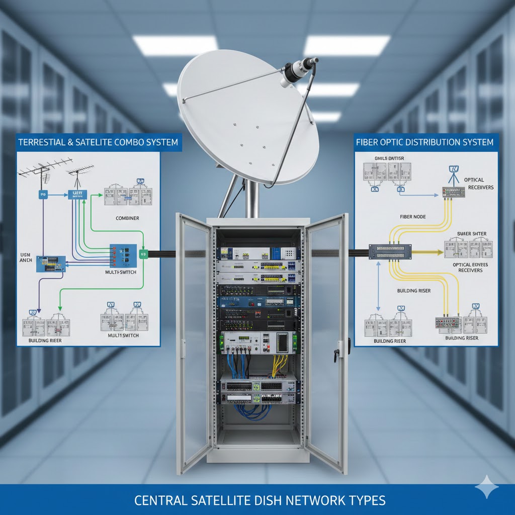 تعتمد أنظمة SMATV على توزيع الإشارة الفضائية من مصدر مركزي إلى جميع الوحدات داخل المبنى باستخدام أجهزة Multiswitch وشبكة كابلات مصممة باحتراف.