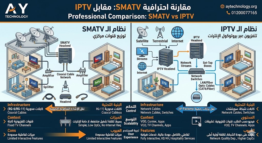 أصبحت شبكات توزيع الأقمار الصناعية المركزية (SMATV) الحل المثالي لتوفير إشارة فضائية مستقرة للمباني السكنية، الفنادق، المستشفيات، والكمبوندات. في هذا الدليل سنشرح بالتفصيل طريقة تصميم شبكة SMATV خطوة بخطوة بداية…