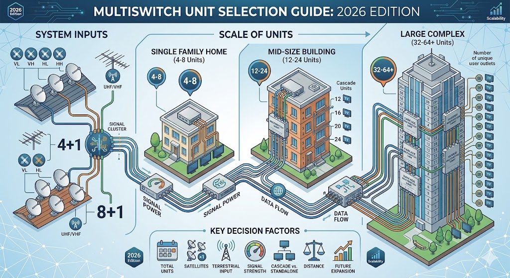 اختيار جهاز Multiswitch مناسب هو الخطوة الأهم في تصميم وتنفيذ نظام الدش المركزي (SMATV) لأي عمارة سكنية أو مشروع تجاري.الاختيار الخاطئ يؤدي إلى ضعف الإشارة، أعطال متكررة، أو تكلفة زائدة…